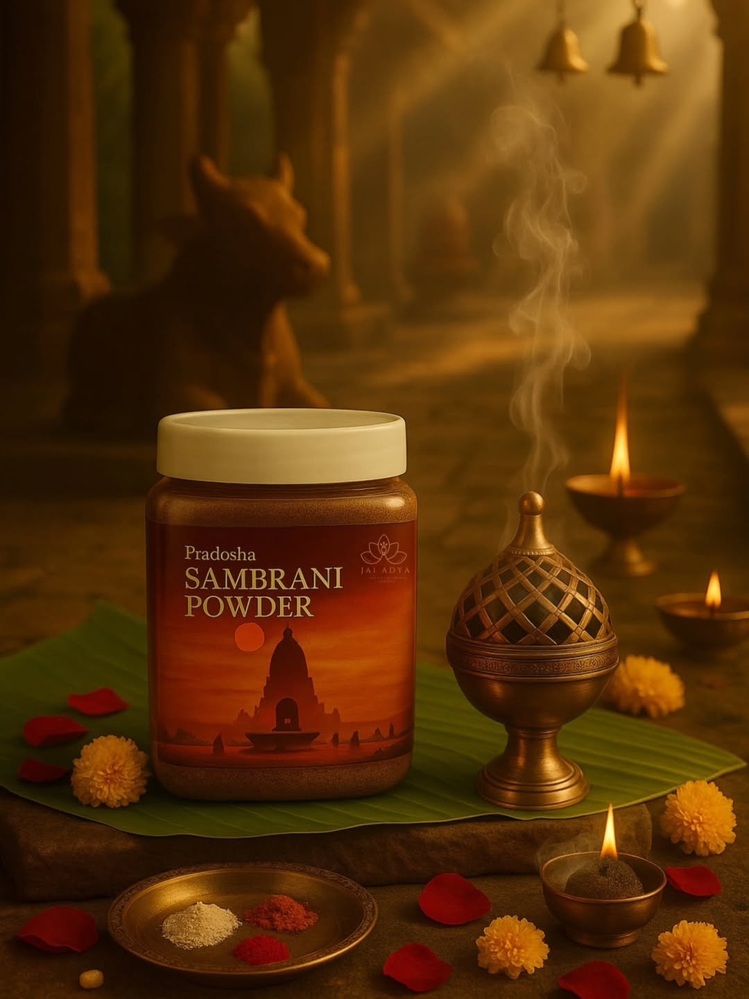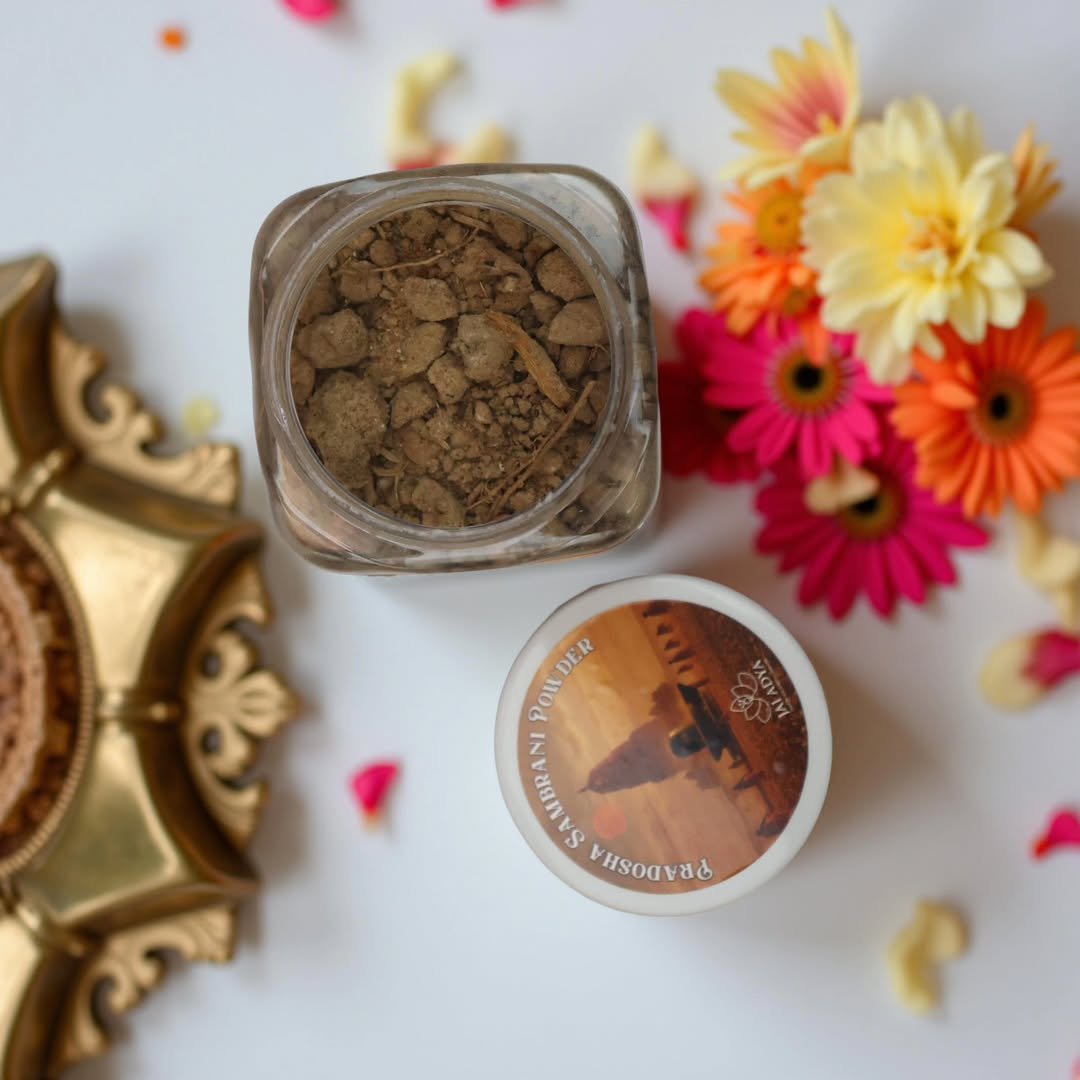 Crafted with devotion, our Pradosha Sambrani Powder carries the spiritual essence of ancient India. Blended using age-old Vedic wisdom, this sacred offering is made from pure herbs, temple resins, and aromatic roots—free from chemicals, charcoal, or artificial scents.